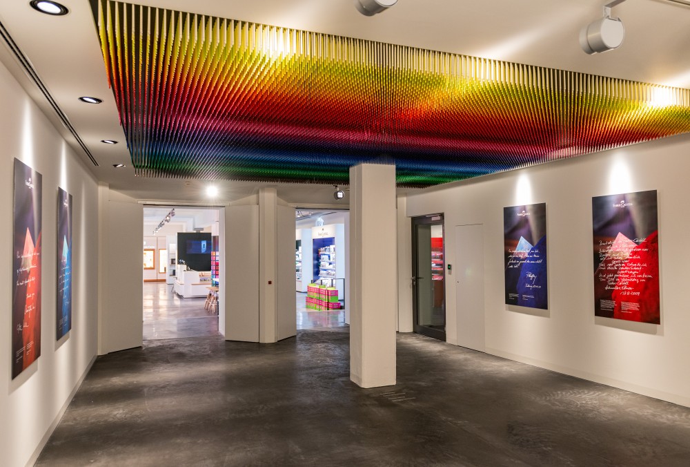Ausganspunkt für das Erleben der Firmenhistorie und der Marke ist das Besucherzentrum. Die Raumgestaltung reflektiert nicht nur den industriellen Jugendstilcharme des frühen 20. Jahrhunderts, sie lässt Besucher auch in die farbenfrohe Welt von Faber-Castell eintauchen: eine Regenbogen-Buntstiftdecke aus ca. 32.400 Einzelstiften geleitet die Gäste in den neuen Flagship-Store, in welchem das Einkaufen auf etwa 200 qm zum Shoppingerlebnis wird.