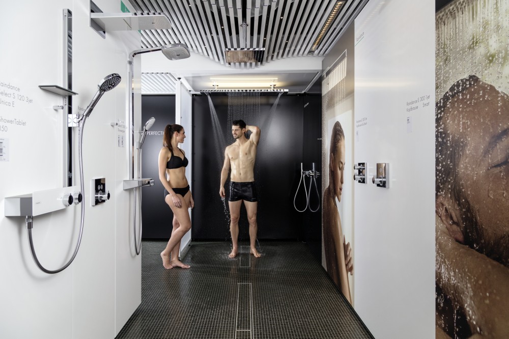 Auch zum Probeduschen lädt die Hansgrohe Aquademie ein: Man kann in der Showerworld eine Stunde lang die aktuellen Produkte genießen. Im Duschparadies des Sanitärherstellers sind 40 verschiedene Brausen zum Testen angebracht.