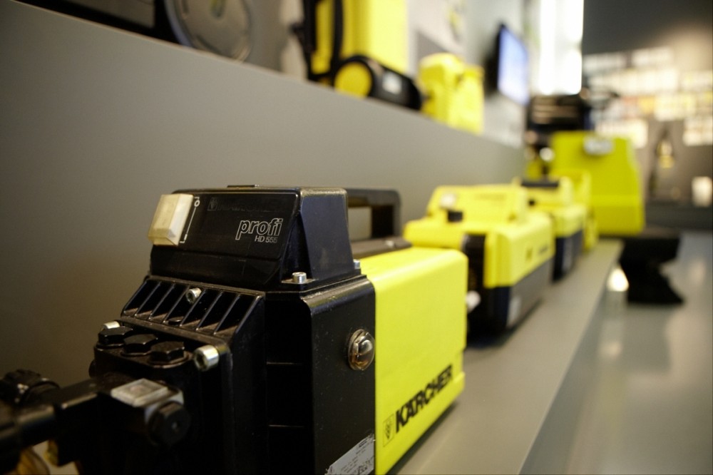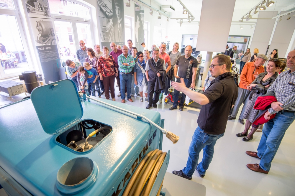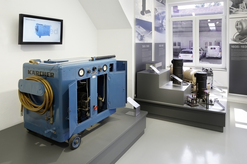 Für den Besucher lässt sich dank der kostenlosen Führungen viel Neues erfahren, für das internationale Publikum stehen englischsprachige Audioguides zur Verfügung. Zum Beispiel wissen die wenigsten, dass die Produkte der schwäbischen Weltmarke in den Dreißigerjahren aus industriellen Salzbadöfen oder Motorenanwärmgeräten bestanden. Auch in der Nachkriegszeit fertigte man bei Kärcher noch einfache „Flüchtlingsöfen“ – kleinere Kochplatten, die mit Kohle oder Holz befeuert wurden, bevor man mit Erfolg in den Reinigungsmarkt einstieg. Der erste Schritt zum großen Durchbruch gelang dem visionären Ingenieur Alfred Kärcher Anfang der Fünfzigerjahre mit der Fertigung seines ersten Heißwasser-Hochdruckreinigers, dem technisch bedeutenden KW 350.