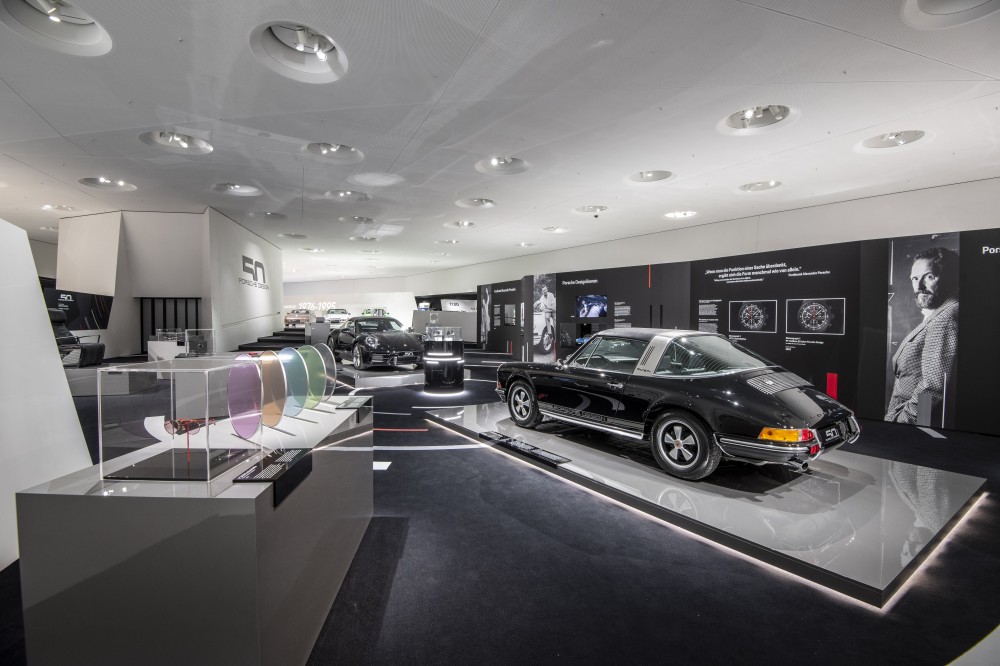 Ebenfalls Teil der Jubiläumsausstellung sind stilprägende Fahrzeuge, die F.A. Porsche schuf oder auch aus seiner privaten Sammlung stammen: Darunter befindet sich der 904 Carrera GTS, den er selbst einst als sein Meisterstück bezeichnete. Aus seinem Nachlass wird ein 911 (993) Speedster zu sehen sein. Der von der Abteilung Porsche Classic im Rahmen des Sonderwunsch-Programmes restaurierte 911 S 2.4 Targa aus dem Porsche Design Gründungsjahr 1972 sowie das neue Editionsmodell „Porsche 911 Edition 50 Jahre Porsche Design“ reihen sich in die Fahrzeugschau ein. Das exklusive Sondermodell ist auf 750 Exemplare limitiert und er-innert in zahlreichen Ausstattungsdetails an die Design-Ikonen von F.A. Porsche. Neben der Exterieurfarbe in Schwarz uni gehören zu den Zitaten die mit Sport-Tex in klassischem Karomuster bezogenen Mittelbahnen der Sitze und der rote Sekundenzeiger der Porsche Design Subsecond Uhr des serienmäßig verbauten Sport Chrono-Paketes.