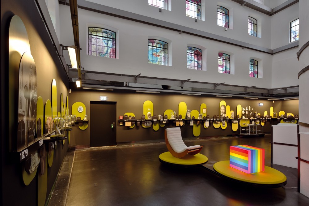 Ein weiterer gestalterischer Höhepunkt sind die 44 Fenster des Brennhauses. Farbenprächtige Dekore auf den Glasscheiben strahlen bei Sonnenschein in die Ausstellung. Dabei verwandelt sich das historische Gebäude in eine Art Industriekathedrale.
